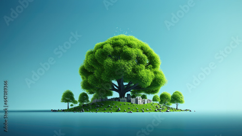 3D illustration of a lush green tree standing tall on a serene island, the great tree of life and nature overlooks a city of concrete, minimalist ecology banner, AI