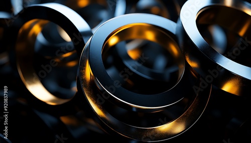 ring, interlocking, black, gold, three-dimensional, illustration, evacuated, floating, lighting, reflections, contrast, aesthetic, visual, modern, sleek, clean, digital, elegant, sharp, design, high technology, futuristic, contemporary, creative, sophisticated, chic, stylish, abstract, geometry, symmetry, luxury, minimalist, artistic, perspective, bright, minimalistic, edgy, interior, decor