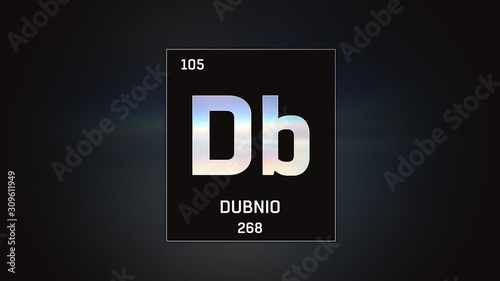 3D illustration of Dubnium as Element 105 of the Periodic Table. Grey illuminated atom design background with orbiting electrons. Name, atomic weight, element number in Spanish language