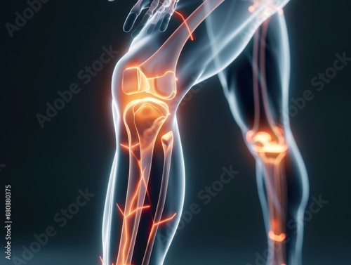 3D illustration of the human knee joint anatomy with highlighted nerves and muscles, emphasizing medical and anatomical details.