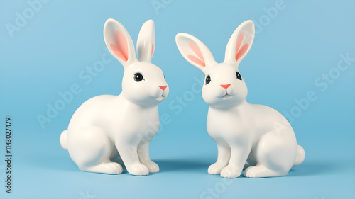 3d illustration of two cute white ceramic rabbit decorations. Animal characters isolated on blue background. Generative AI