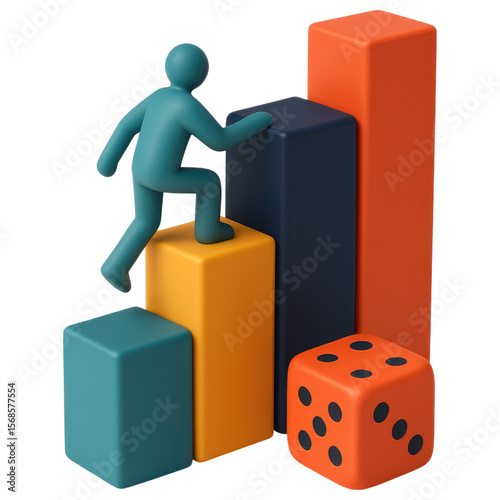 three-dimensional, illustration, person, climbing, chart, block, growth, success, dice, gamble, risk, opportunity, progress, achievement, business, goal, strategy, planning, development, future, career, ambition, motivation, step, challenge, obstacle, ascending, improvement, elevation, bar chart, cube, figurine, graphic, design, marketing, finance, investment, statistic, datum, visualisation