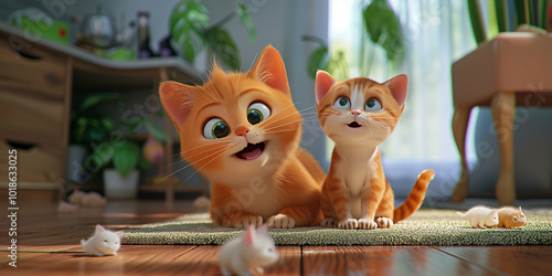 3D images of a happy cat mom and a baby kitten sitting next to each other, one of which is a kitten