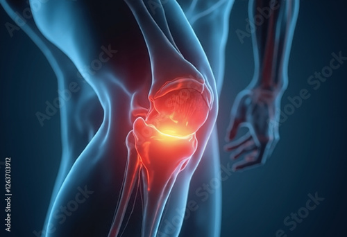 3D medical illustration of human knee joint with highlighted pain area