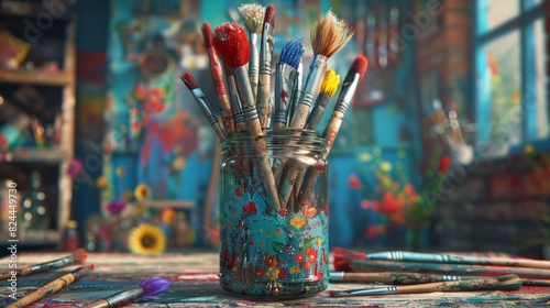 3D model showcases artist's brush set in jar against art studio backdrop, soft focus with ample space above