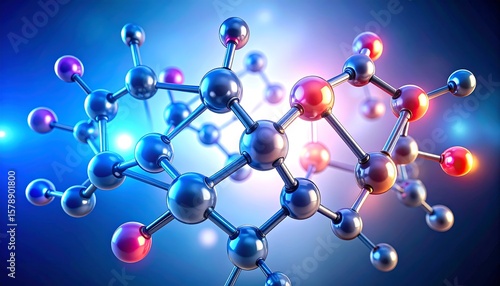 molecular, structure, atom, bond, chemical, three-dimensional, science, model, digital, illustration, vibrant, colourful, sphere, metallic, connection, complex, network, scientific, glowing, light, background, technology, display, abstract, modern