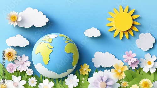 3D paper cut world Earth Day with spring flowers, sun, and clouds on a blue background.