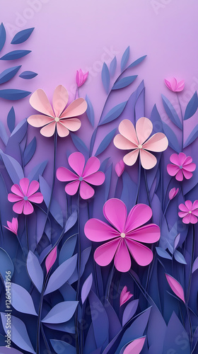 3D paper-cut style purple background with pink flowers