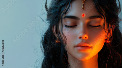 woman, indian, three-dimensional, portrait, young, calming, dreamlike, cultural, jewellery, meditation, adult, eyes closed, traditional, serene, peaceful, contemplative, spiritual, artistic, design, female, beauty, tranquil, realistic, character, expressive, emotional, headset, light background, praying, dreamer, ethnic, concentration, relaxation, devotion, mindfulness, visualisation, hope, inner peace, imaginative, person