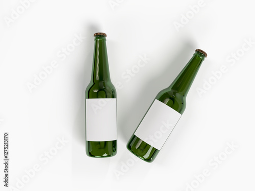 3D Realistic beer bottle green glass mockup container with blank label. Lager Beer isolated on white background with metal lid and liquid within. Concept of alcohol brand, drink, party, holiday, ads