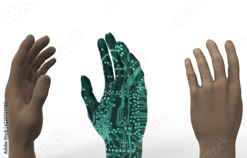 future, digital, circuit, hand, real, three, perspective, modern, computer, robot, glove, isolated, white, finger, glove, finger, signs, work, object, human, green, protective, protection, symbol, palm, safety, concept, thumb, pair, blue, equipment, skin