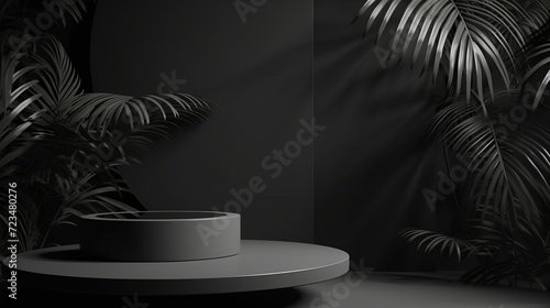 3d render mockup podium stand table shelf. Black white abstract background. Palm tree leaf shadow. Nature. Dark gray. Design beauty product cosmetics. Wall stage room studio. Design concept. Creative