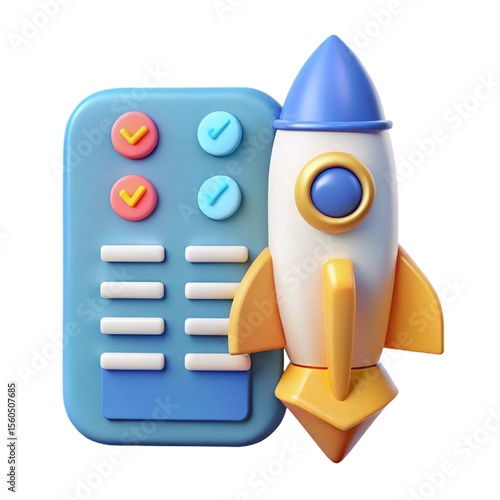 three-dimensional, illustration, cartoon, rocket, ship, spacecraft, launch, start, project, checklist, list, task, completed, checkmark, done, progress, success, goal, planning, organisation, business, startup, innovation, growth, development, future, concept, design, graphic, icon, symbol, element, digital, art, rendering, clean, minimalist, bright, colourful, blue, yellow, white, isolated, background, object, visual, creative