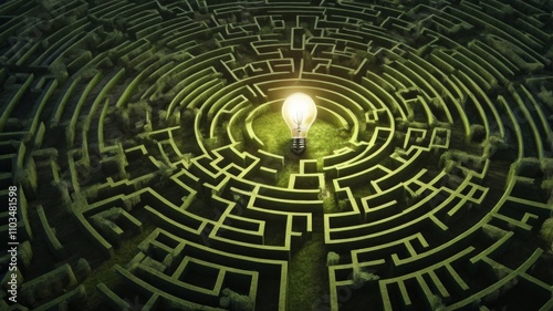 "3D Render of a Maze with a Glowing Light Bulb at the Core"