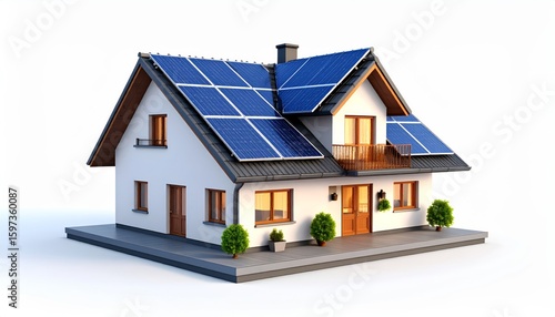 3D render of a small residential house model with a roof and solar panels on a white background, ideal for real estate and construction