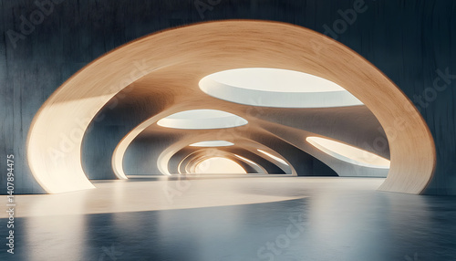3D render of abstract futuristic architecture with empty concrete floor, product and car presentation background, copy space, Geometric structure design