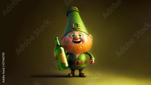 3D Render of Cheerful Leprechaun Man Holding Alcohol Bottle On Olive Green Background. St. Patrick's Day Concept.