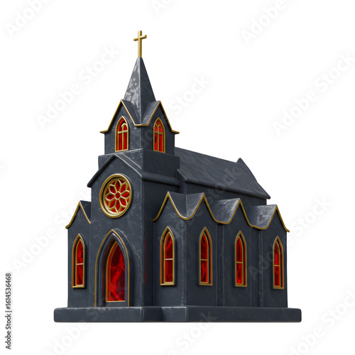 3D Render of Gothic Black Church with Red Windows and Golden Cross Isolated on Transparent Background