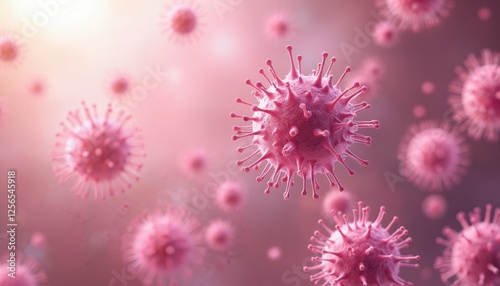 3D render of pink virus-like cells on blurred light pink background. Microscopic pathogens illustration shows viral disease, infection spreading. Scientific medical research of flu, coronavirus,