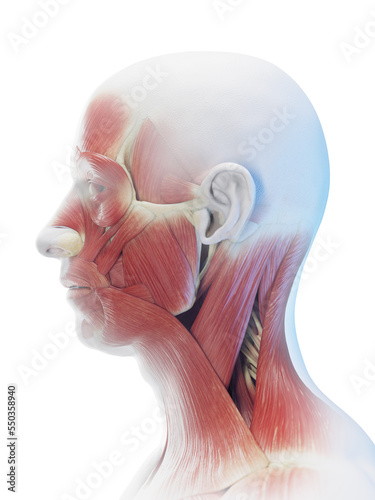 three-dimensional, rendering, artwork, medicals, medicine, anatomy, biology, science, physiology, human, organ, body, illustration, graphic, man, male, internal, x-ray, inside, transparent, on white, lateral, head, ear, muscle, muscular, mouth, nose, scalene, skin, skull, eye, lip, portrait, cheek, skull, forehead, chin, jaw, neck, buccinator, chew, smile, frown, wrinkle
