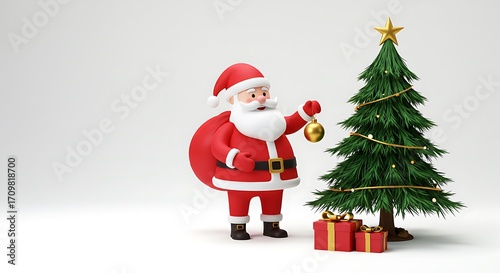 3D rendering of a cheerful Santa Claus character decorating a festive Christmas tree with golden ornaments and wrapped gifts below, set against a clean white background.