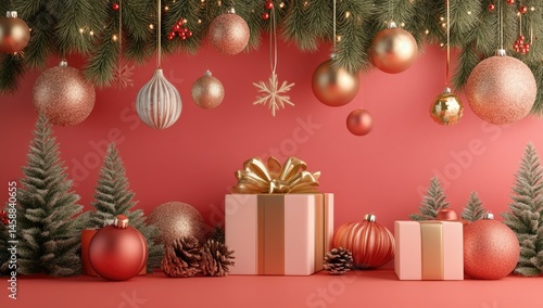 3D rendering of a Christmas present box with a golden ribbon bow and decoration balls on a dark red background.