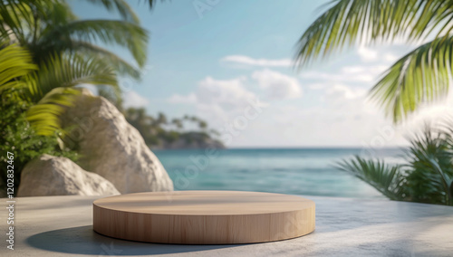 3D rendering of a circular wooden podium with a tropical beach backdrop, ideal for displaying products with a serene and scenic coastal view.