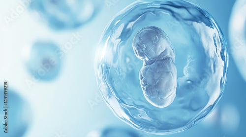 3D rendering of a human embryo cell in early development, floating in a fluid environment, symbolizing life sciences, biotechnology and medical innovation.