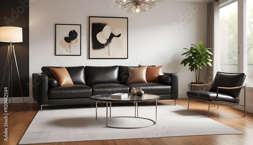 3D rendering of a luxury and modern living room featuring a high-end leather sofa and a stylish lamp.