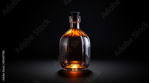 3D rendering of a single brown glass liquor bottle with a black cap on a black background.