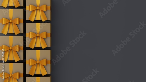 3d rendering of beige gift boxes with golden bows forming a pattern on gray background, with copy space.