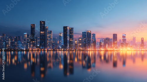 3D Rendering of city scape. Large tall buildings and glowing signs reflection on river. View from dock port. For business product advertising technology transport background. 16547817 1