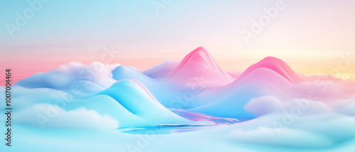 3D Rendering of soft Mountains, Rivers, Clouds, waves and Mist – Solid Pastel Colors Background in C4D and Blender Style