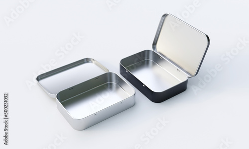 3D rendering of square shaped Hinged Tin box on white background.