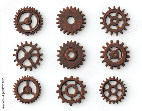 3D rendering of various gears in grid layout on white background, showcasing intricate designs and textures. Perfect for mechanical or industrial themes