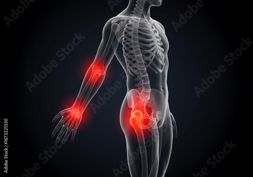 3D skeletal model with glowing red highlights on painful elbow, wrist, and hip joints.