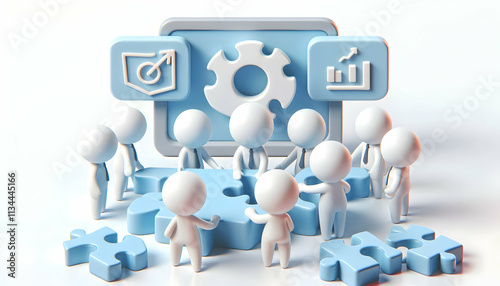 3D Soft abstract digital art with team members solving puzzle copy space below. concept as Team members solving a puzzle on a soft abstract digital art background representing collaboration and proble