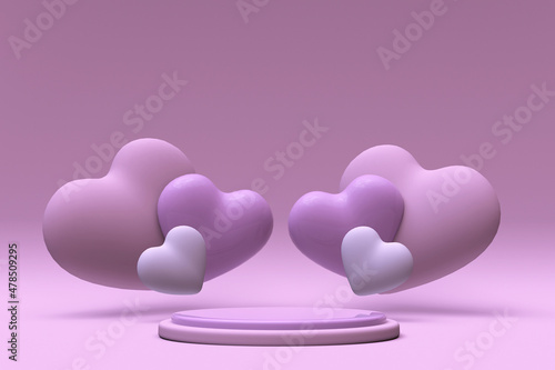 3D St Valentine Day pink minimal background with podium and flying heart shape. Romantic design template. Mockup for 14 february