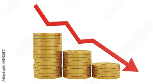 three-dimensional, buttons, signs, background, transparent, coin, stack, arrow, red, gold, down, fall, finance, money, economy, loss, decrease, investment, market, crisis, business, wealth, currency, banking, financial, decayed, risk, recession, profit, capital, value, income, trade, cash, asset