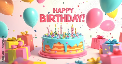 3D text "HAPPY BIRTHDAY!" with a colorful birthday cake and presents on a white background bright colors, cute, cheerful, birthday party vibe, gift boxes flying around, balloons floating Generative AI