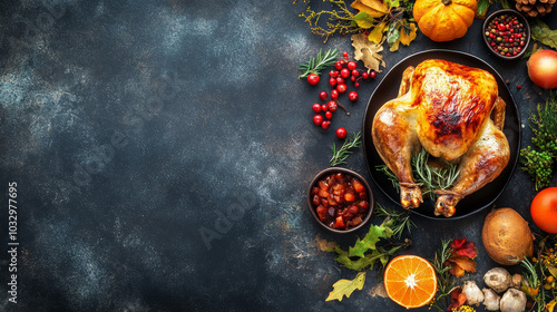 3D thanksgiving roasted turkey with berry fruits pumpkin vegetables decoration celebration black food fashion cement background with copy space