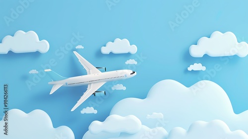 3D vector render of an airplane in summer skies, white clouds, and blue backdrop