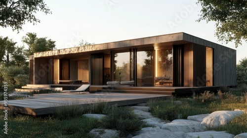 3D visualization of a chic modern house featuring clean lines and a spacious terrace.
