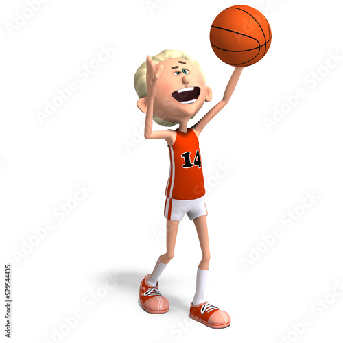 3D-illustration of a cute and funny cartoon basketball player dribbling and throwing a ball