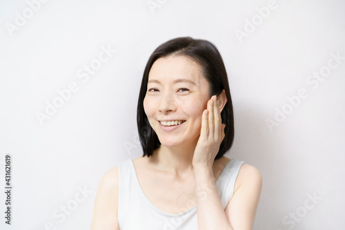 woman, skincare, smile, beauty, massage, cosmetic, japanese, health, 50's, mother, homemaker, skin, middle-aged, smile, face, menopause, asian, fold, relax, youth, mother, mother, copy space, ageing, lifestyle, lively, aged