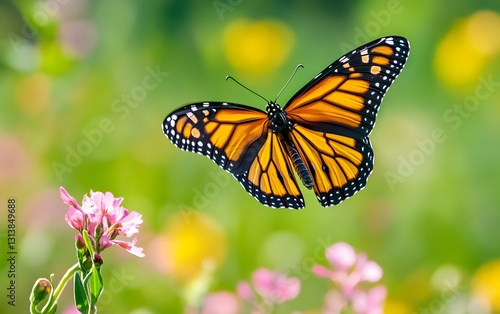 43. A beautiful, vibrant monarch butterfly in flight over a meadow
