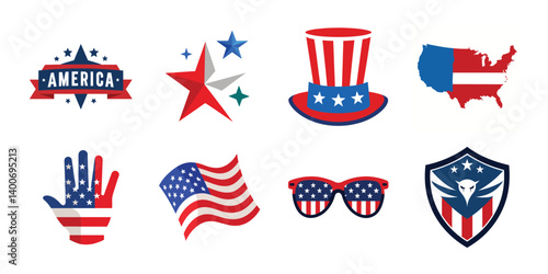july, vector, american, independence, flag, star, stripes, patriotic, holiday, freedom, us, fireworks, celebration, design, illustration, art, graphic, red, white, blue, nation, history, culture, tradition, shield, decoration, banner, poster, summer, festival, event, print, digital, creative, clip, icon, symbol, logotype, eagle, hat, sunglasses