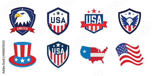 4th of July vector elements set. Collection of American Independence Day vectors, shield, banner, hat, sunglass, map collection