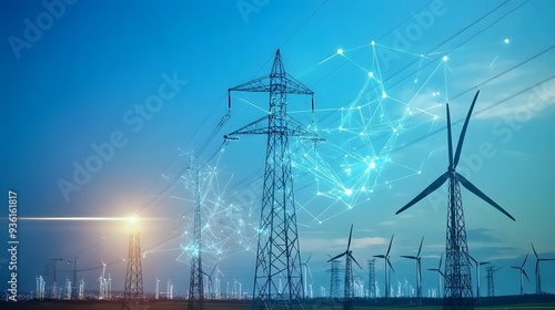 wind, farm, generating, electricity, connecting, grid, power, energy, electric, tower, sky, pylon, line, high, cable, voltage, wire, industry, technology, electrical, steel, blue, pole, industrial, sunset, field, transmission, supply, cable, wire