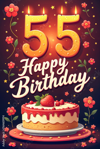 cake, candle, flower, birthday card, 55, birthday, card, holiday, strawberry, happy, number, 50, celebration, greeting, festive, decoration, wishes, joy, party, illustration, greeting card, gift, present, colourful, age, year, year, anniversary, congratulation, fun, joyful, cheerful, happiness, concept, unusual, background, template